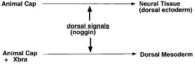FIG. 2. Experiment by Cunliffe and Smith (1994) illustrating how a differential response to the same signal can be generated. Animalcaps treated with noggin became neural. When animal caps were injected with Xbra, a mesoderm-specific transcription factor, the explants became dorsal mesoderm in response to the same noggin signal. |