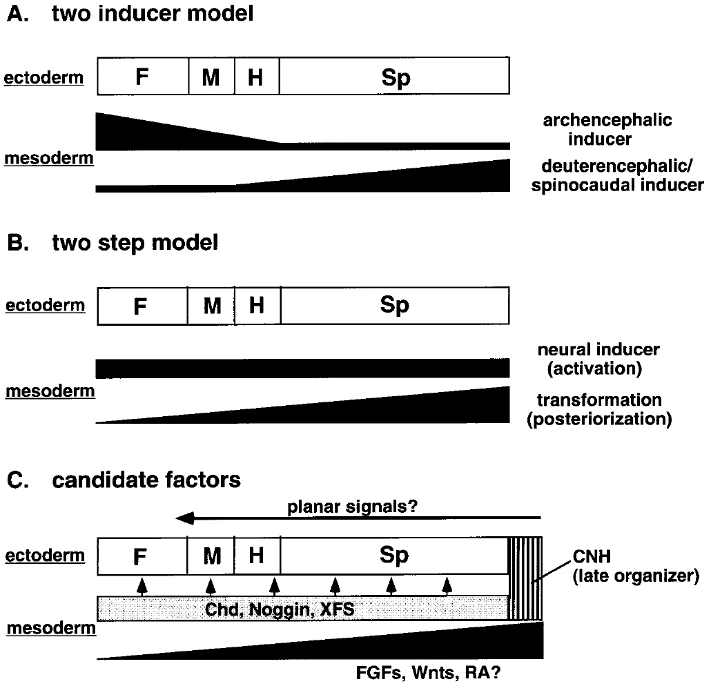 step model. First, the neural inducers initiate neural differentiation of the ectoderm. The neural inducers, when acting alone, promote