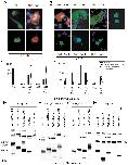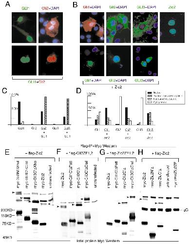Fig. 7. Cooperative effects and physical interactions within the Gli superfamily. (A) (Top left) Human GLI1 is nuclear in transfected COS cells, here detected with specific polyclonal anti-human GLI antibodies (Lee et al., 1997). (Top right) Myc-tagged Gli2 is cytoplasmic. (Bottom left) Co-expression of GLI1 and Gli2 results in nuclear localization of Gli2 (bottom right). (B) (Top panels) Expression of Myc-tagged frog Gli1, Myc-tagged-Gli2, Myc-tagged GLI3 and FLAG-tagged Zic2 in COS cells. (Bottom panels) Co-expression with Zic2 forces the Gli1, Gli2 and GLI3 cytoplasmic proteins into the nucleus. DAPI staining highlights nuclei (blue). The color of the font indicates the protein visualized by immunostaining. (C,D) Quantification of the subcellular compartmentalization of Gli proteins when transfected alone versus co-transfection with human GLI1 (C), and when transfected alone versus co-transfection with Zic2 (D). (C) Only nuclear values are given for co-transfection of Gli2 and GLI1 and for GLI3 and GLI1. (E-H) (Top panels) Immunoprecipitation of Flag-tagged proteins with anti-FLAG Ab as labeled, followed by western blotting with anti-Myc Ab. Arrowheads indicate the immunoprecipitated species. (Bottom panels) Corresponding western analysis of total Myc-protein input from transfected COS cells as labeled. The horizontal alignment of bottom panels corresponds to the molecular weight markers on the left. |