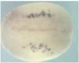 ascl2 ( achaete-scute family bHLH transcription factor 2 ) gene expression in Xenopus laevis embryo, assayed via in situ hybridization, NF stage 14, dorsal view, anterior up. |