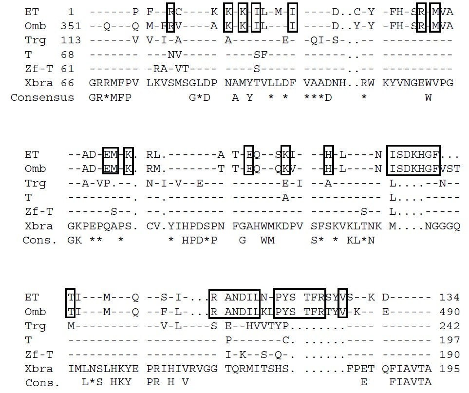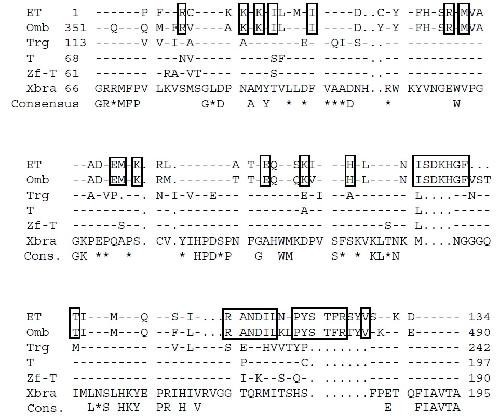 Fig. 2. Alignment of the predicted primary sequence within the T domain of ET with those of other T domain proteins. A dash (-) indicates identity to Xbra. A period (.) indicates a gap. Residues shown in the consensus line are those identical in all known T domains while a star (*) indicates a highly but not absolutely conserved residue. Boxed residues are conserved only between ET and Omb. Omb is the predicted product of the Drosophila gene optomotor blind (Pflugfelderet al., 1992). Trg is that of the Drosophila T related gene involved in hindgut development (Kispert et al., 1994). T, Zf-T (or Ntl) and Xbra are the mouse, zebrafish and Xenopus T proteins respectively (Hermann et al., 1990; Smith et al., 1991; Schulte- Merker et al., 1992). Numbers for the ET sequence indicate positions predicted from the PCR fragment while numbers for known T domain proteins are positions in corresponding full-length proteins. |