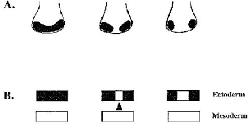 Fig. 11. Retina primordium formation in vertebrate embryos. (A) Our model of retina field development. Dorsal views of the anterior neural plate are illustrated here. There is initially a single retina morphogenetic field in the anterior neural plate of vertebrate embryos. Retina formation is suppressed in its median region, resulting in the resolution of the retina field into two retina primordia. (B) The prechordal plate provides a primary signal for retina field resolution. These are transverse section views of the anterior neural plate and its underlying prechordal mesoderm. Experiments reported here demonstrate a role for the prechordal plate while those performed in zebrafish embryos suggest the midline of the neural plate also plays a role (Hatta et al., 1991, 1994; Hatta, 1992; Macdonald et al., 1995; Ekker et al., 1995b). |