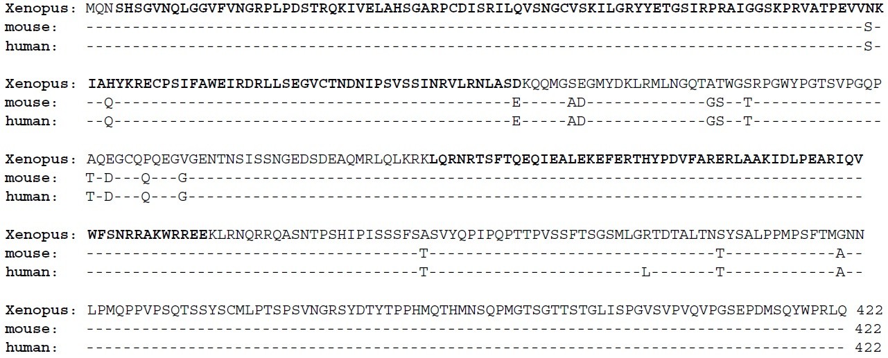 Fig. 4. Comparison of Pax-6 sequence from Xenopus with those from other species. Alignment of the predicted sequences of full-length Pax-6 proteins from Xenopus, mouse and human. A dash (-) indicates identity to the Xenopus sequence. The paired domain (amino acid residues 3-133) and homeo domain (residues 209-269) are in bold. |