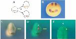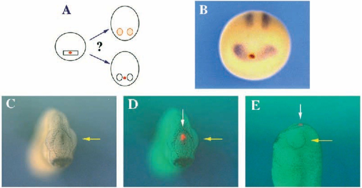 Fig. 6. Fate mapping of midline cells in the retina field of Xenopus embryos. A to D show anterior views. (A) A diagram showing that midline cells in the retina field were labeled by DiI at stages 12 or 12.5 and followed to stage 25 to determine whether the midline cells migrate to the lateral regions. (B) The original location of DiI-labeled cells. This embryo was labeled with DiI at stage 12 and fixed at stage 12.5. DiI was photoconverted to produce the brown spot in the middle of the retina field, which was revealed by in situ hybridization with the Xenopus Pax-6 probe. (C) An image of a stage 25 embryo illuminated by incident light. A yellow arrow points to an eye. (D) A composite of the image shown in C and an image of the same embryo viewed under rhodamine optics to map the location of the fluorescent cells. A yellow arrow points to an eye. This embryo was previously labeled with DiI at stage 12.5. Results were similar with embryos labeled at stage 12. (E) A left side view of another DiI-labeled embryo. Note the absence of DiI labeled cells in the left retina. A white arrow points to DiI-labeled cells. A yellow arrow points to an eye. |