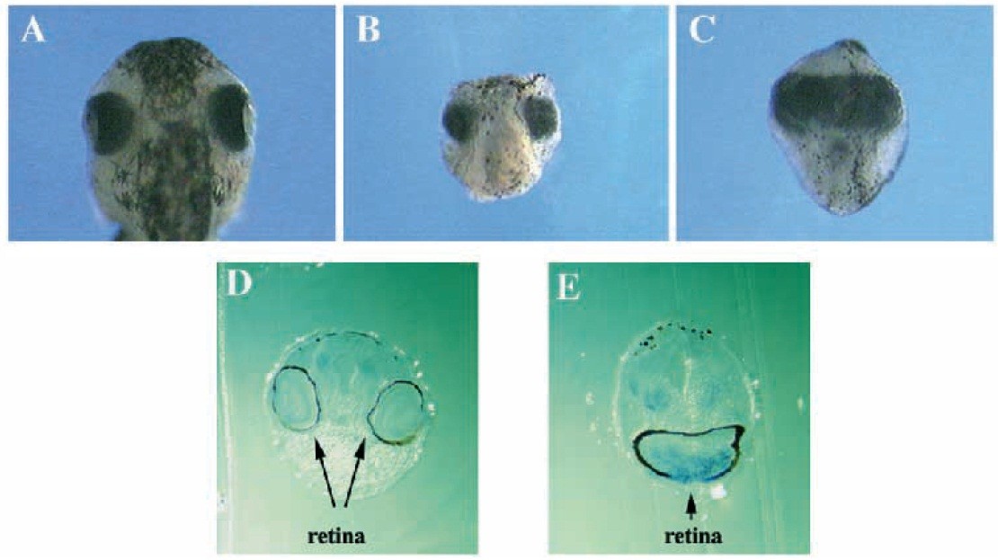 Fig. 7. Effects of removing the prechordal mesoderm on retina formation in Xenopus embryonic explants. (A) A wild-type embryo at st. 35. (B) A st. 35 control explant of the anterior neural plate with the underlying prechordal mesoderm. (C) An anterior neural plate explant without prechordal mesoderm. The explants were isolated at st. 12.5 and cultured until st. 35. (D) A transverse section of a st. 42 control explant after in situ hybridization with a Pax-6 probe. (E) A transverse section of a st. 42 explant without prechordal mesoderm at st. 12.5 and fixed for in situ hybridization with Pax-6 at st. 42. Note the presence of Pax-6 expressing neural retina as well as the retina pigment epithelium. |