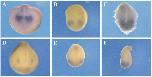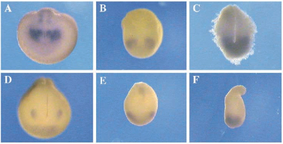 Fig. 8. Effects of prechordal mesoderm removal on retina field resolution in Xenopus embryonic explants. (A) A control embryo hybridized with Pax-6 at st. 18. (B) Pax-6 expression in a control anterior neural plate explant with the underlying mesoderm, showing two separate primordia by st. 18. (C) Pax-6 expression in a st. 18 explant of the anterior neural plate without the underlying mesoderm. Note the retina field did not resolve into two separate primordia. (D) A control embryo hybridized with ET at st. 18. (E) ET expression in a st. 18 control explant with the prechordal mesoderm. (F) ET expression in a st. 18 explant without prechordal mesoderm. |