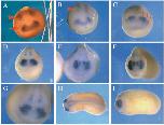 Fig. 3. The expression pattern of ET in Xenopus embryos. A to G show anterior views and H is a lateral view. (A) A stage (st.) 12.5 embryo with a band of expression in the anterior neural plate (indicated by the arrow) and one in the primordium of the cement gland (indicated by the arrowhead). Note that the cement gland stays a single structure (A, C-G), whereas the retina band resolves into two primordia in the next few stages. (B) A st. 15 embryo showing retina field expression. The embryo was oriented to maximize visualization of retina expression and the cement gland is thus hardly visible. (C) A st. 16 embryo with ET expression weaker in the median region of the retina field than that in the lateral regions. (D) A st. 18 embryo with two distinct retina primordia. There is no ET expression in the median region. (E) A st. 19 embryo with no midline expression. (F) A st. 20 embryo. Note that weak expression of ET appears in the pineal gland primordium. The intensity of this signal increases in later stages (see G and H). (G) A st. 22 embryo with ET expression in the retina, the cement gland and the pineal gland (the dot between the two eyes). (H) A st. 26 embryo. The staining in the eye is restricted to the dorsal retina, absent from the lens and the ventral retina. Expression in the cephalic ganglia and lateral line organ also appeared. (I) A transverse section of a st. 28 embryo showing ET expression in the dorsal retina. ET is expressed in all layers of the retina, and completely absent from the lens. Dorsal is to the right. |