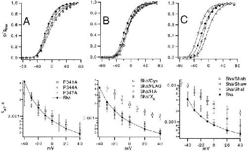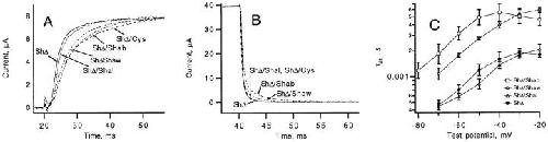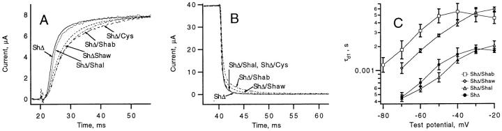 (B) Deactivation time courses at â60 mV after a prepulse to +40 mV. Currents from ShÎ/Shal, ShÎ/Shaw, and ShÎ/Shab were scaled by