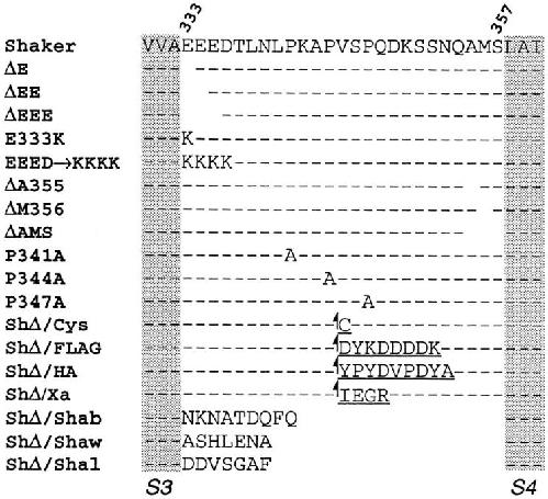 Figure 2. Mutations of the Shaker S3-S4 region. The wild-type