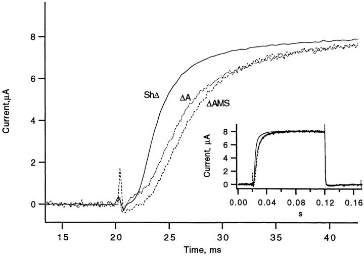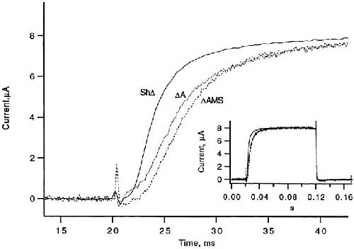courses are shown in the inset. The ΔA and ΔAMS current recordings were scaled by factors of 1.57 and 2.54 to match the steady-state current in the ShΔ recording.