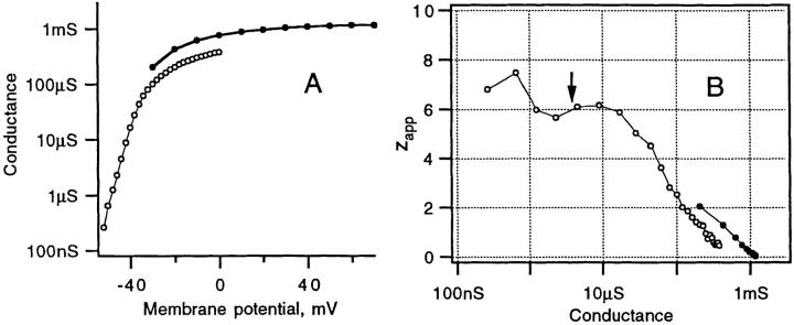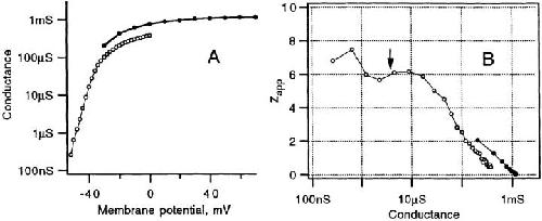 depolarizations are plotted as filled circles. (B) Values of zapp, computed as the logarithmic derivative of G with respect to voltage according to Eq. 2 are plotted as a function of G as in Zagotta et al.