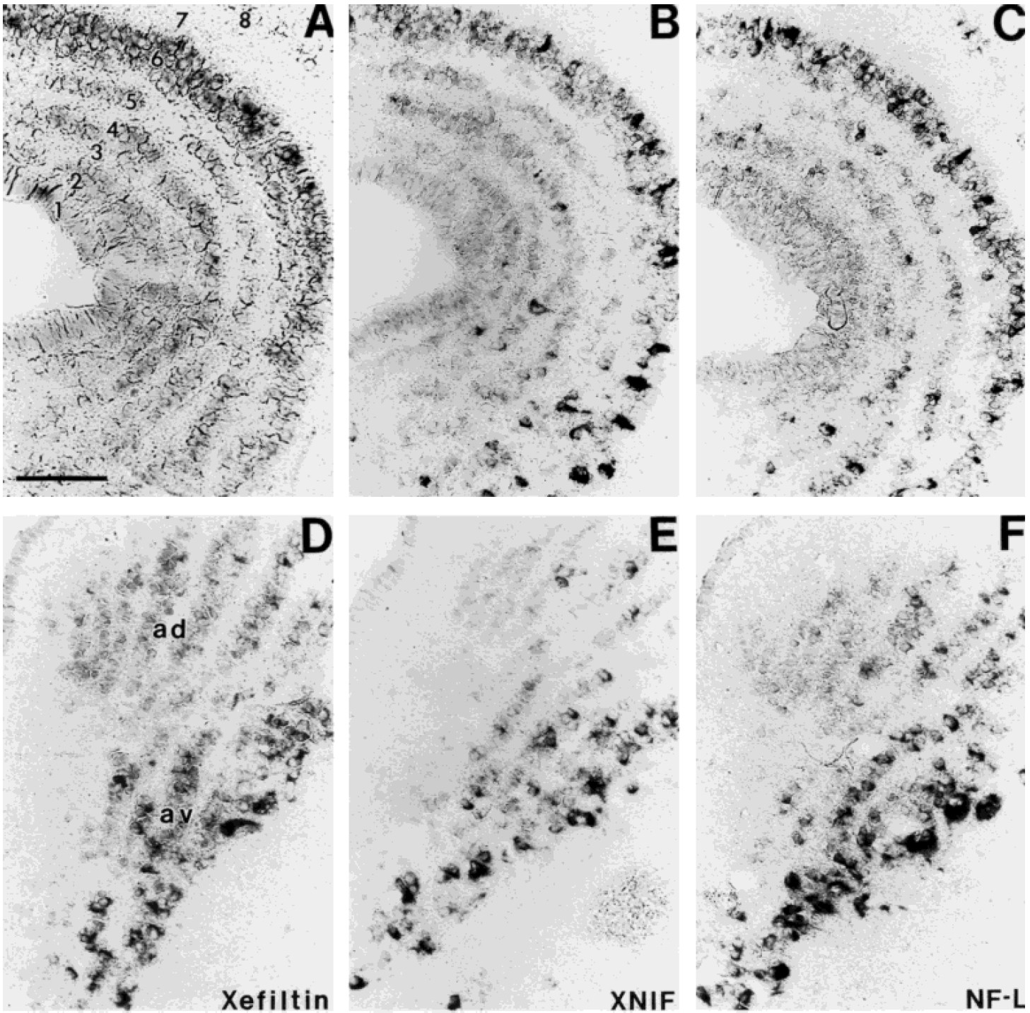 levels of XNIF (B,E) and NF-L (C,F). In the olfactory nuclei of the