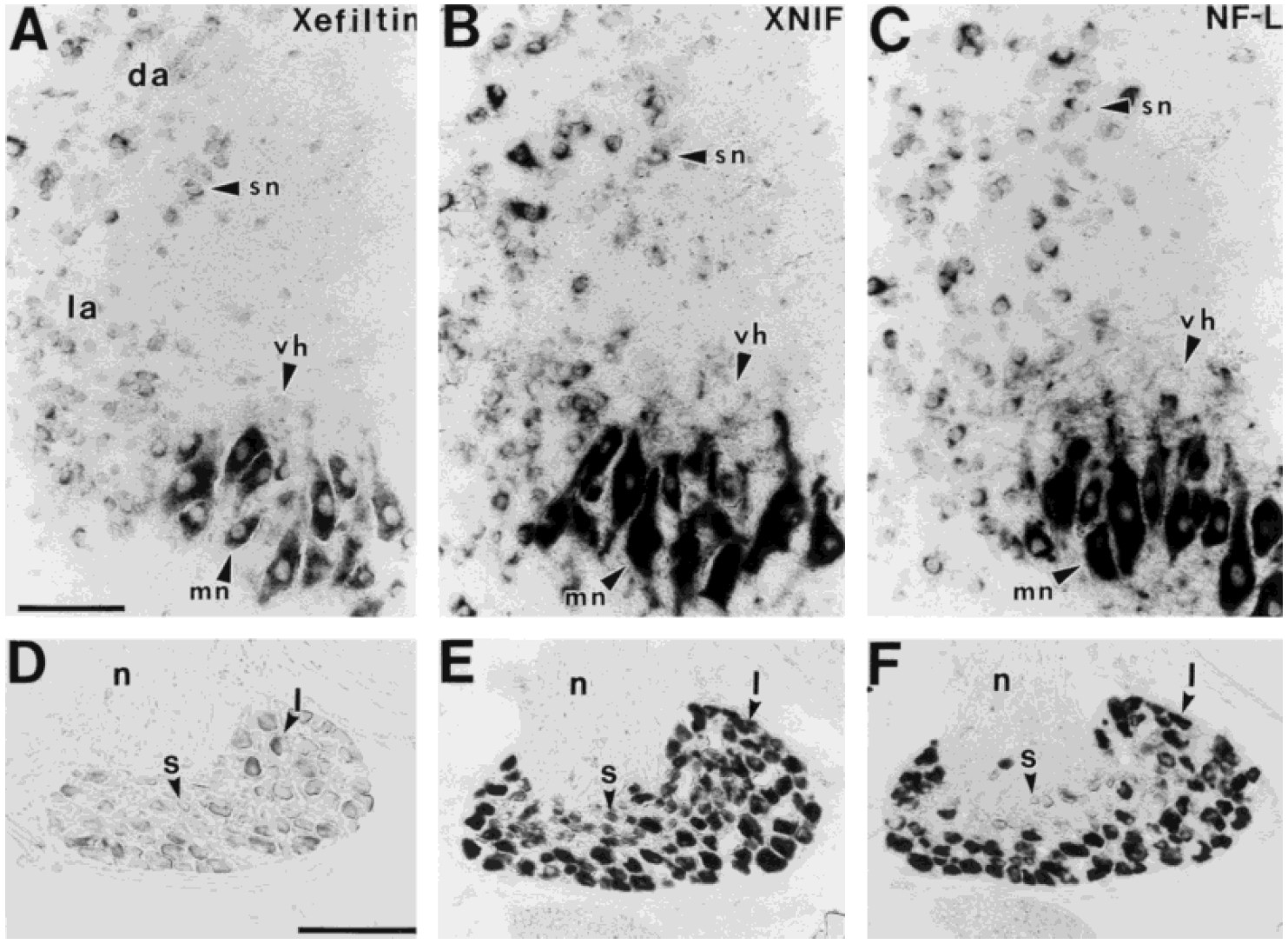 Fig. 7. Xefiltin (A,D), XNIF (B,E), and NF-L (C,F) mRNA expression