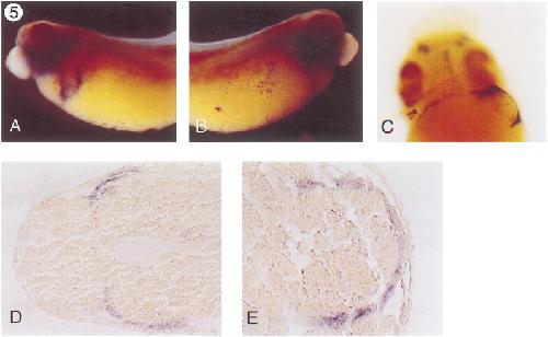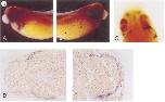 FIG. 5. Xbap expression in the gut. A and B are at 301 magnification and C is at 701 magnification. (A) Lateral view of the left side of a stage 38 embryo stained for Xbap. Note the domain of Xbap expression in the gut. (B) Lateral view of the right side of the embryo pictured in A illustrating absence of gut staining. (C) Ventral view of a stage 40 embryo stained for Xbap mRNA showing expression in the developing gut tube on the left side of the embryo. Anterior is up. (D) 1001 magnification of a horizontal section through a stage 37 embryo showing Xbap transcripts in a layer of cells underneath the outer ectoderm on both sides of the embryo. Anterior is to the left. (E) 2001 magnification view of a horizontal section through a stage 41 embryo showing Xbap expression on the left side, partially encircling the gut tube. Anterior is up.