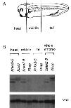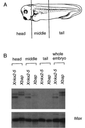 (A) Stage 34 embryos were dissected into head, middle, and tail sections as indicated and total RNA was isolated. (B) Xbap transcript distribution assayed by RNase protection. Total RNA from the head, middle, or tail segments of stage 34 embryos was assayed using either Xbap or XNkx2-5 probe. Both XNkx2-5 and Xbap probes generate two protected fragments, most likely due to dupli- cated genes in the pseudotetraploid Xenopus genome (Kobel and Du Pasquier, 1986). Equal RNA input was determined with the Max probe.
