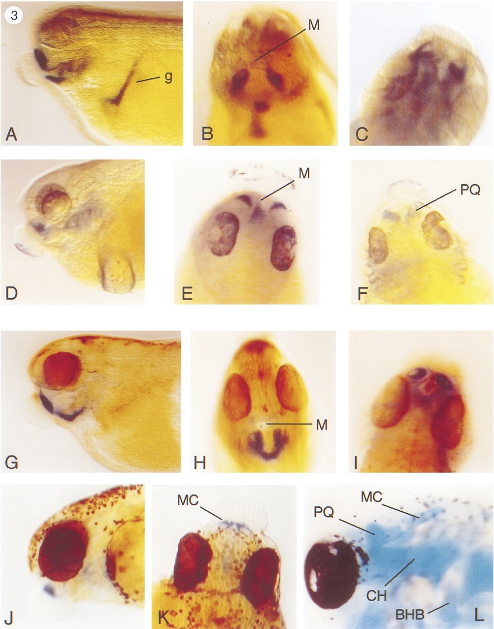 FIG. 3. Whole mount in situ hybridization pattern of Xbap [cc: now called nkx3-1] (A, B, C, D, E, and F) and gsc (G, H, I, J, and K) and Alcian blue staining to visualize cartilage (L). All embryos were photographed at 701 magnification except for (D) at 601. (A) Lateral view of a stage 36 embryo showing both regions of facial staining and the region of gut expression (indicated by g in the figure). (B) Anterior view of the embryo pictured in (A). The paired anterior regions of expression lie on either side of the future mouth opening (M). (C) Dorsal view of a stage 37 embryo showing the forked appearance of the Xbap staining. (D) Lateral view of the left side of a stage 42 embryo showing staining of the anteriorgut tube and facial staining. (E) Dorsal view of a stage 40 embryo. Xbap staining now marks crescent-shaped regions on either side of the future mouth opening (M). (F) Dorsal view of the embryo shown in (D). The region of staining corresponding to the palatoquadratecartilage (PQ) is indicated. (G) Lateral view of a stage 36 embryo showing gsc expression in the face. (H) Anterior view of the embryo pictured in (G). Compare the gsc staining pattern with that of Xbap in (B) and note the vertical nature of the bilateral patches of staining and the broad domain of expression of the midline staining. (I) Dorsal view of the embryo shown in G and H. (J) Lateral view of a stage 42 embryo stained for gsc transcript. (K) Dorsal view of the embryo pictured in J showing the convergence of the gsc staining at the embryonic midline. (L) Ventral view of the head of a stage 43 embryo stained for cartilage. Compare the location of the palatoquadratecartilage (PQ) with that of Xbap staining in similar stage embryos (E and F). Meckel cartilage (MC), ceratohyalcartilage (CH), and basihyobranchialcartilage (BHB) are also shown.