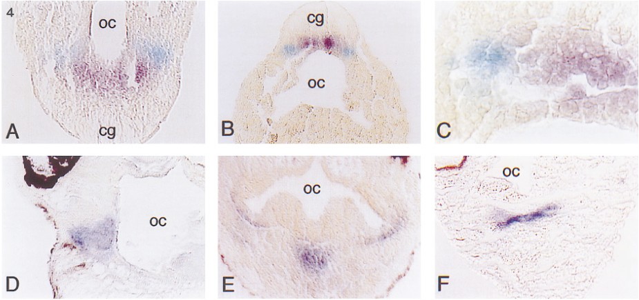 FIG. 4.Sections through the mouth region of embryos stained for Xbap [cc: now called nkx3-1]mRNA (A) or gsc mRNA (A, B, C, and F). Horizontal sections are oriented with anterior at the top. Transverse sections have ventral to the bottom. The positions of the cement gland (cg) and the oral cavity (oc) within the sections are indicated. All sections were photographed at 1001 magnification except C, which is 4001. (A) Transverse section through a double-stained stage 37 embryo. Xbap staining is blue and gsc staining is purple. Both sequences are expressed ventrolat- eral to the oral cavity with Xbap occupying a more lateral position. (B) Horizontal section through the a stage 37 embryo showing Xbap and gsc expression anterior to the oral cavity. Xbap staining marks more lateral tissues. (C) Magnified view of the section shown in B. Notice that the Xbap and gsc staining regions closely abut and appear to overlap in a small area (gray region). (D) Transverse section through the middle of the oral cavity of a stage 37 embryo stained for Xbap sequences alone. Intense Xbap staining is restricted to a small region of tissuelateral to the oral cavity. (E) Transverse section through the posterior of the oral cavity of a stage 37 embryo stained for Xbap alone. A narrow region of Xbap expression is located ventral to the oral cavity, while fainter staining extends upward along the edges of the cavity. (F) Transverse section through the posterior of the oral cavity of a stage 37 embryo stained for gsc alone. Notice that the domain of gsc expression is broader than the Xbap expression shown in E.