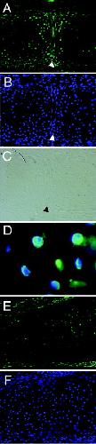 Figure 6. Immunoreactivity for phosphorylated Smad-1/5/8 (pSmad-1/5/8). The joint-like formation was stained for pSmad-1/5/8 (A,D) and for nuclei by DAPI (B,D). Bright field (C). Arrowheads show identical cells. D: Double labeling for pSmad-1/5/8 (green) and nuclei (blue) in the joint-like region showing nuclear-localization of pSmad-1/5/8. E: The intact spike was stained for pSmad-1/5/8 (E) and for nuclei by DAPI (F). Comparing with A, weaker signals of pSmad-1/5/8 proteins were observed in the intact spikecartilage.