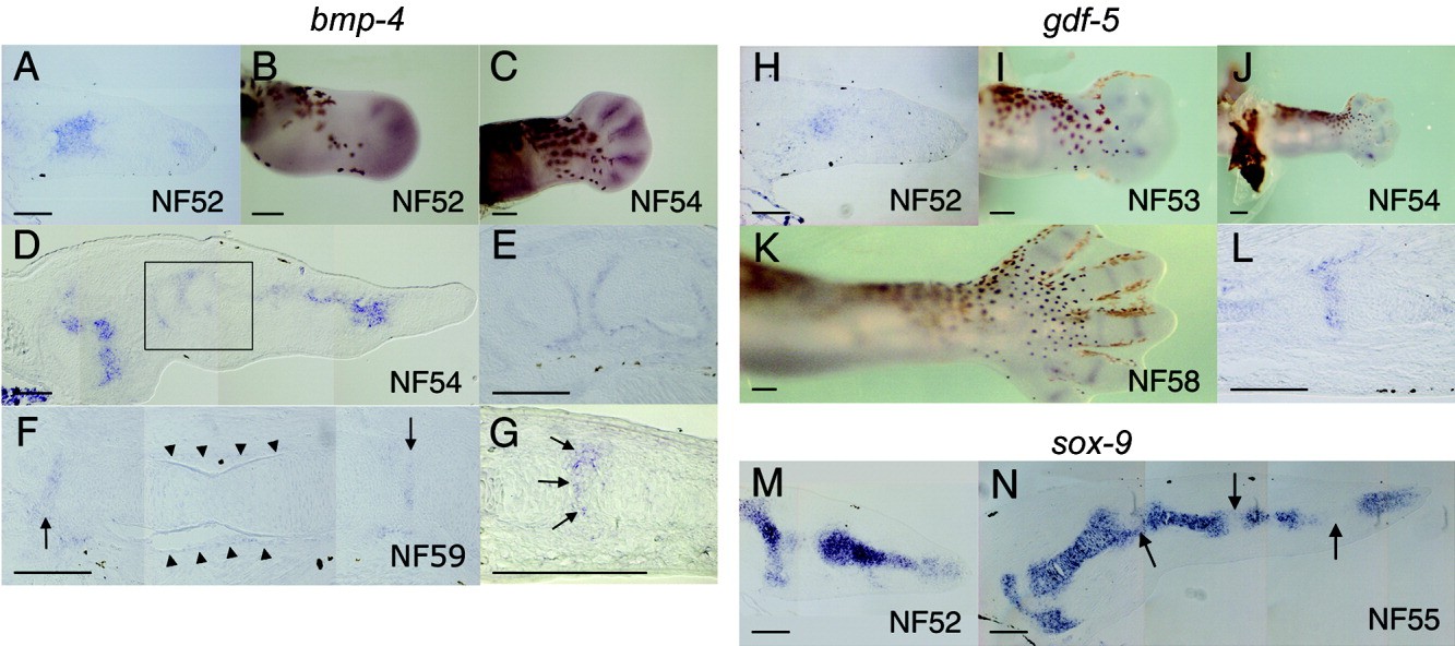Figure 3. Expression patterns of bmp-4, gdf-5, and sox-9 during hindlimb development. A,B: Bmp-4 expression in Xenopus st52 hindlimb bud. Section revealed that bmp-4 was expressed in both proximal and distal regions (A). Bmp-4 was also expressed in the distal region (B). C: In st54 limb bud, bmp-4 was expressed in the interdigital regions. D: The section of the st54 hindlimb bud revealed the expression in perichondrial cells surrounding the skeletal element. E: Higher magnification of the boxed region in D. F,G: In st59 hindlimb, bmp-4 was expressed in the joint region (F,G, arrows) and the perichondrium (F, arrowheads). Bmp-4 expression was detectable in the digit-joint region, that is, before the differentiation into three layers (G, arrowheads). H-L: Gdf-5 expression in the developing hindlimb bud. In st52 hindlimb bud, gdf-5 was expressed at low levels in the posterior region, which was similar to the expression of bmp-4 (H). In the st53 hindlimb bud, gdf-5 expression was detectable in the autopodium (I). Gdf-5 expression was restricted to the joint region (J). In the st58 hindlimb bud, clear signals of gdf-5 expression were detectable in the joint region (K). The section revealed that the expressions were restricted to the joint region and also slightly detectable in chondrocytes (L). M: Sox-9 was strongly expressed in chondrocytes. The sox-9 expression was detectable broadly from the distal to proximal regions. N: In the st55 hindlimb bud, sox-9 expression in the presumptive joint region was decreased (arrows). Scale bar = 200 mu m.