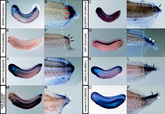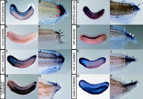 Figure 4. Whole mount in situ hybridization of up-regulated genes categorized according to function as cell signaling, cell differentiation, and cell structure genes. Tailbud stage embryo (A, C, E, G, I, K, M, O) and regenerating tail on day 5 (B, D, F, H, J, L, N, P). Lateral view, dorsal side up, anterior to the left. Red arrowheads, the proximal region of the regenerating tail; white arrowheads, notochord; black arrows, spinal cord; white arrows, fin epidermis; broken line, the plane of amputation. A, B: Expression of SFRP2 (XL040a14). C, D: Expression of KLG/PTK7 (XL005m14). E, F: Expression of ATF5 (XL049c20). G, H: Expression of cysteine-rich protein (XL014c20). I, J: Expression of HMG-17 (XL034a15). K, L: Expression of HMG-X (XL069l01). M, N: Expression of endo B keratin (XL024e24). O, P: Expression of keratin 8 (XL080o09). |