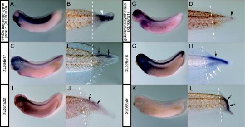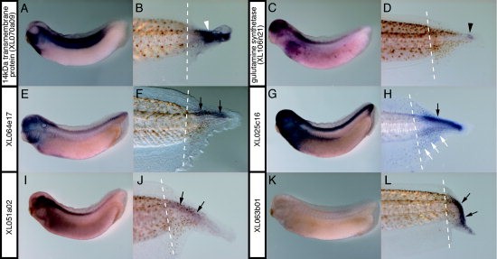 Figure 5. Whole mount in situ hybridization of unclassified and novel up-regulated genes. Tailbud stage embryo (A, C, E, G, I, K) and regenerating tail on day 5 (B, D, F, H, J, L). Lateral view, dorsal side up, anterior to the left. White arrowhead, regenerating muscles; black arrowhead, the terminal vesicle of the regenerating spinal cord; black arrows, spinal cord; white arrows, blood cells; broken line, the plane of amputation. A, B: Expression of 14kDa transmembrane protein (XL070a09). C, D: Expression of glutamine synthetase (XL106n21). E, F: Expression of XL064e17. G, H: Expression of XL025c16. I, J: Expression of XL051a01. K, L: Expression of XL063b01. |