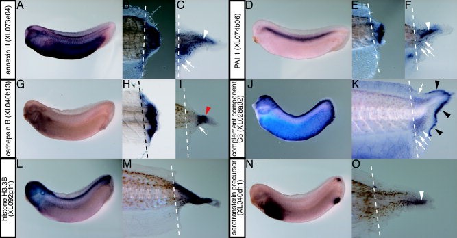 Figure 3. Whole mount in situ hybridization of up-regulated genes, grouped according to function as wound healing, inflammation response, and cell proliferation genes. Tailbud stage embryo (A, D, G, J, L, N), regenerating tail on day 2 (B, E, H), and regenerating tail on day 5 (C, F, I, K, M, O) were hybridized with DIG-labeled RNA probes. Lateral view, dorsal side up, anterior to the left. White arrowheads, notochord; white arrows, blood cells; red arrowhead, uncharacterized cells; black arrowheads, wound epidermis; broken line, the plane of amputation. AâC: Expression of annexin II (XL073e04). DâF: Expression of PAI1 (XL074b06). GâI: Expression of cathepsin B (XL040b13). J, K: Expression of complement component C3 (XL028a02). L, M: Expression of histone H3.3B (XL092g11). N, O: Expression of serotransferrin precursor (XL040d11). |