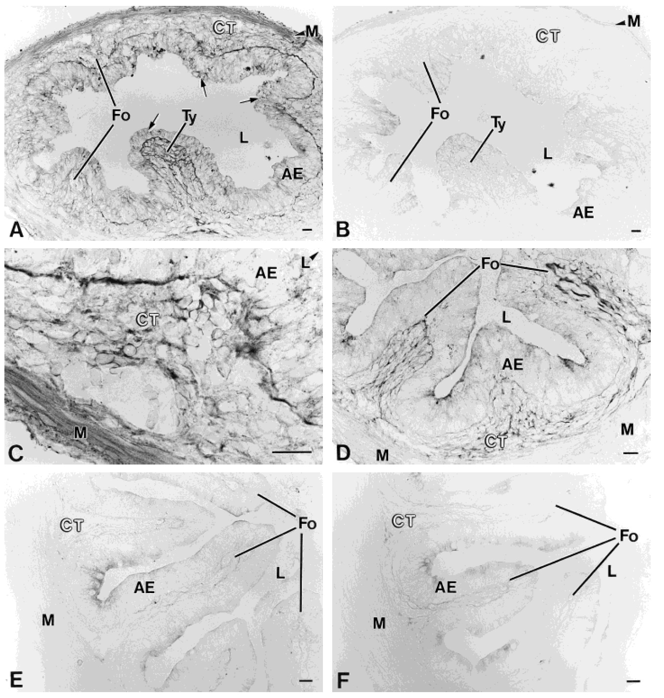 tissue cells are localized in the bottom of the typhlosole (arrows).