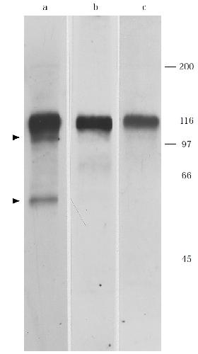 Identi®cation of b"-integrin in biotinylated fractions of RPE extracts. The epithelium was labeled on its apical (lanes a and c),