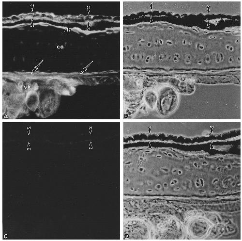 endothelial cells) (ch), while reaction with scleral cartilage (ca) is relatively weak. Labeling of the pigment epithelium (between