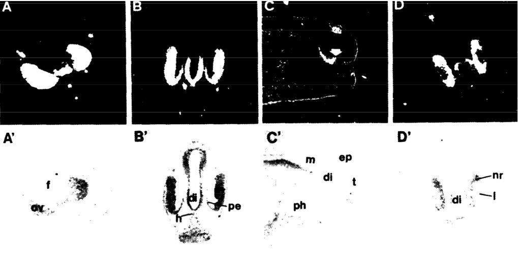 (D) Dorsal view of a stage 28 embryo. Anterior is to the bottom. The fainter staining between the eyes is the diencephalon floor.