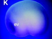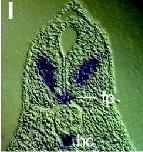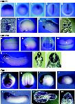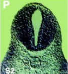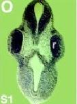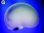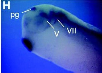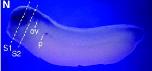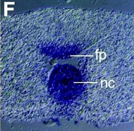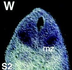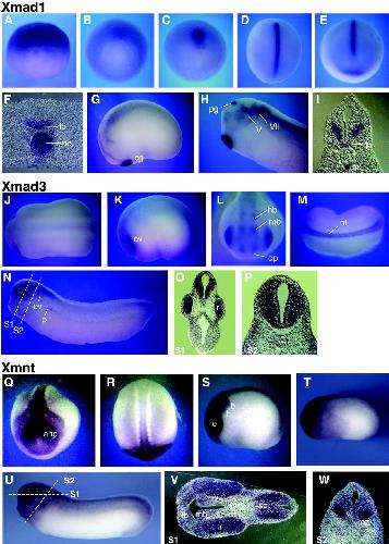 Figure 3. Spatial expression pattern of Xmad1, Xmad3, and Xmnt in Xenopus embryos. (A-I) Xmad1, (J-P) Xmad3, and (Q-W) Xmnt. (A) Stage 6.5 lat., (B) stage 10 veg., (C) stage 11 veg., (D) stage 13 d., (E) stage 17 ant., (F) stage 17, transversal section, (G) stage 19, (H) stage 27, (I) stage 27, transversal section, (J) stage 20 d., (K) stage 20 lat., (L) stage 23 ant., (M) stage 23 d., (N) stage 29, (O) transversal section S1 of N, (P) transversal section S2 of N, (Q) stage 19 ant., (R) stage 19 d., (S) stage 20 lat., (T) stage 23 lat., (U) stage 27, (V) stage 27 sagittal section S1, and (W) stage 27 transversal section S2. anp, anterior neural plate; b, branchial crest segment; cg, cement gland; d, dorsal; ev, eye vesicle; fb, forebrain; fp, floor plate; h, hyoid crest segment; hb, hindbrain; hc, hypochord; lat, lateral; mz marginal zone; nc, notochord; nt, neural tube; veg, vegetal; mb, midbrain; op, olfactory placode; otic vesicle; P, pronephros; pg, pineal gland; sc, spinal chord; r, retina; V, trigeminal ganglion; VII, geniculate ganglion. The dashed line indicates the plane of the section. |