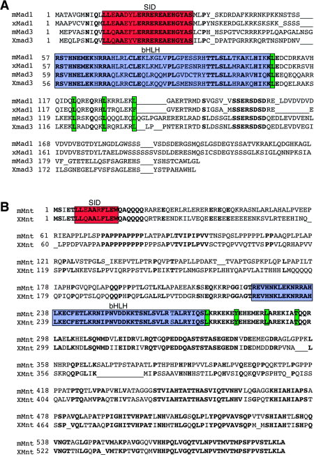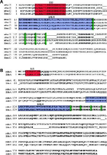 Figure 1. Amino acid alignment of the predicted open reading frame (ORF) of Xmad1, Xmad3, and Xmnt (GenBank accession numbers: AY964104, AY964105, and AY964106) with the corresponding mouse sequences. A: Comparison of Mad1 and Mad3 protein. B: Comparison of Mnt sequences. The SID repressor domain, the bHLH domain, and the leucine zipper domain are indicated by green, red, and blue bars, respectively. The overall amino acid identity shared between the Xenopus and mouse sequences was: Mad1 (72%), Mad3 (60.4%), and Mnt (55.7%); within the SID domain: Mad1 (95%), Mad3 (90%), and Mnt (80%) and within the bHLH domain Mad1 (92%), Mad3 (70%), and Mnt (100%). |