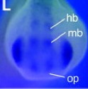 mxd3 (MAX dimerization protein 3) gene expression in Xenopus laevis embryo, assayed via in situ hybridization, NF stage 23, anterior view, dorsal up. |
