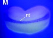 xmt (MAX network transcriptional repressor ) gene expression in Xenopus laevis embryo, assayed via in situ hybridization, NF stage 27, transverse section, through spinal chord at pharyngeal level, dorsal up. |