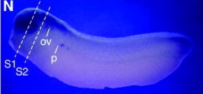 mxd1 (MAX dimerization protein 1) gene expression gene expression in Xenopus laevis embryo, assayed via in situ hybridization, NF stage 19, lateral view, anterior left, dorsal up. |