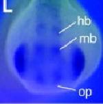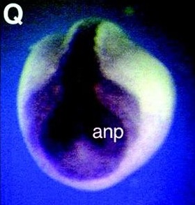 mnt (MAX network transcriptional repressor) gene expression in Xenopus laevis embryo, assayed via in situ hybridization, NF stage 19, anterior view, dorsal up. |