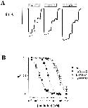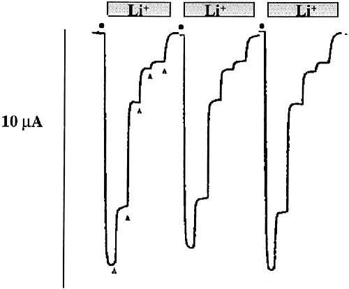 Figure 2. Representative tracings of macroscopic inward Li+current recorded in three different oocytes expressing wild-type ENaC αβγ subunits. Substitution of 20 mM KCl with 20 mM LiCl in the external sucrose buffer medium (•) induced an inward Li+current that was inhibited by addition of 10 nM, 100 nM, 330 nM, 660 nM, 5 μM indicated by the filled triangles (▴). |