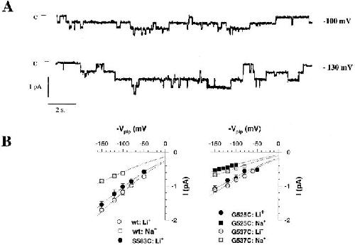 Figure 4. Effects of introducing Cys residues in pre M2 segment at positions αS583, βG525, and γG537. (A) Single channel tracings of βG525C mutant recorded with Na+as permeating ion. (B) Left: I-V relationships of wt ENaC and αS583C mutant. Cord conductance for wt ENaC (wt) in the presence of Na+was 5.1 and 10 pS with Li+. Li+conductance of αS583C was 8.9 pS. Right: I-V relationships for βG525C and γG537C. In the presence of Na+and Li+ions, cord conductances were, respectively, 3.2 and 5.8 pS for βG525C, 4 and 6.23 pS for γG534C. Dotted lines represent fit of the data of the I-V relationships according to the constant field equation. Each point represents mean value of two to five channels. |