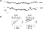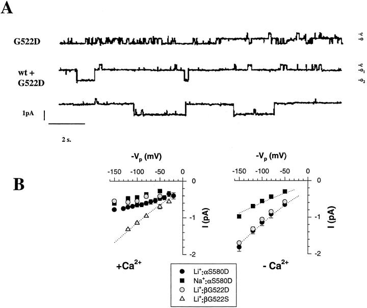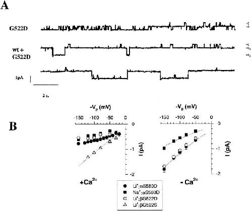 Figure 8. Effects on single channel conductance of introducing negatively charged residues Asp in the pre-M2 segment of αβ subunits. (A) Upper tracing shows single channel recording in oocytes expressing α, βG522D, γ mutants. The lower tracings were recorded from an oocyte expressing both βG522D and β wild type together with α and γ subunits. Two channels with different conductances can be observed. (B) Left: I-V relationship of αS580D, βG522D, and βG522S in the presence of with 1.8 mM Ca2+ in the patch pipet. Cord Li+conductance was 9.6 pS for βG522S. Right: I-V relationship of S580D, G522D in the absence of Ca2+ in the pipet. Cord conductance were 6.7 and 11 pS for S580D in the presence of Na+and Li+respectively and 11 pS for βG522D with Li+ions. Each point represents a mean value of three to five channels. |