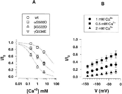 Figure 9. Block of αS580D, βG522D, γG534E mutants by external Ca2+. Mutant subunits were coexpressed with α, γ wild-type subunits. (A) Concentration dependence of inhibition of Li+current by external Ca2+. The ratio I/I0 represents the measured ILiin the presence/absence of external Ca2+ions. Ca2+ inhibitory constants (Ki) obtained from fit to inhibition Langmuir isotherm (dotted lines) were 2.1 mM for the αS580D (n = 8), 0.4 mM for βG522D (n = 10), and 2.2 mM for γG534E (n = 8). (B) Voltage dependence of βG522D mutant block by external Ca2+ at concentrations of 0.5, 1, and 2 mM (n = 4). Dotted lines represent fit of the data to Eq. 2 (see materials and methods) gave Ki(0) values of 0.67, 0.97, and 0.49, z′ values of 0.26, 0.28, and 0.35 for the experiments done with respectively 0.5, 1, and 2mM Ca2+. |