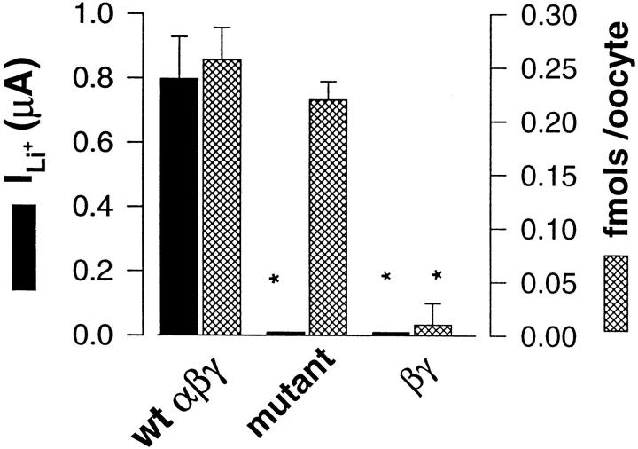 Figure 3. Cell surface expression and macroscopic ILiof wt ENaC (n = 39), triple Cys mutant (αSCβSCγSC) (n = 36) and βγ subunits (n = 41). Filled bars represents ILi. Hatched bars represents specific binding per oocyte of M2AB ([125I]M2IgG1) antibodies (fmols/oocyte) directed against a FLAG epitope introduced in the ectodomain of β and γ wt and mutant subunits. *Denotes statistical significance <0.001. |