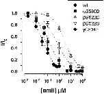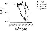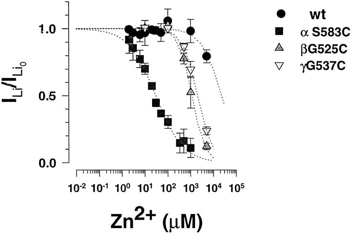 Figure 6. Block of wt ENaC and mutants by external Zn2+. Concentration dependence of Zn2+ inhibition of inward Li+current. I/I0represents the current ratio measured in the presence/absence of external Zn2+. Inhibitory constants (Ki) were obtained from best fit of the data to a Langmuir inhibition isotherm (dotted lines). Zn2+ Ki were >10 mM for wt ENaC (n = 34), 29 μM for αS583C (n = 42), 1.1 mM for βG525C (n = 10), and 1.9 mM for γG537C (n = 14). |