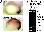Xnr3 and Xwnt-ll. Dorsal is to the right and animal on top. Note expression of both genes in the epithelial layer of the dorsal blastopore lip. (B) Dorsal