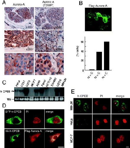 Expression and localization of Aurora-A and CPEB in cancer cells. (A) Immunohistochemical studies of Aurora-A in breast tumor. The frozen sections were prepared from invasive ductal breast carcinomas and immunostained with anti-Aurora-A polyclonal antibodies (left column), or with anti-phospho-Aurora-A (T288P) polyclonal antibodies (right column). Note that high levels of Aurora-A with phosphorylation on Thr288 were found in the cytoplasm. (B) Cytoplasmic distribution of exogenously expressed Aurora-A. HEK293T cells were transfected with plasmid encoding Flag-tagged Aurora-A cDNA, and 48 h after the transfection, cells were fixed and stained with anti-Flag antibodies and labeled with FITC (upper panel). 100 transfected cells were scored for the distribution of Flag-Aurora-A protein; nuclear dominant (N > C), cytoplasmic dominant (N < C) or equally distributed (N = C) (lower panel). (C) Northern blot analysis of h-CPEB in human cancer cell lines. A membrane transferred with 40 µg of electrophoresed total RNA from a human cancer cell was hybridized with 32P-labeled h-CPEB DNA probe. The single 3.3 kb transcript is marked. Ethidium bromide staining for detection of 18S rRNA of the total RNA is shown as a loading control. (D,E) Subcellular localization of h-CPEB. (D) HeLa cells were transfected with plasmid encoding GFP-h-CPEB, and GFP fluorescence (green) with DNA which was stained with propidium iodide (red) and their merged picture is shown (upper panels). NIH3T3 cells were co-transfected with HA-h-CPEB and Flag-Aurora-A, and immunostained with anti-HA (green) or anti-Flag monoclonal antibodies (red) and merged picture is shown (lower panels). Scale bar indicates 10 µm. (E) MM-LM, HeLa and MCF cells were fixed and stained with polyclonal antibodies to h-CPEB and labeled with FITC (green). DNA was counterstained with propidium iodide, PI (red). Scale bar indicates 10 µm.