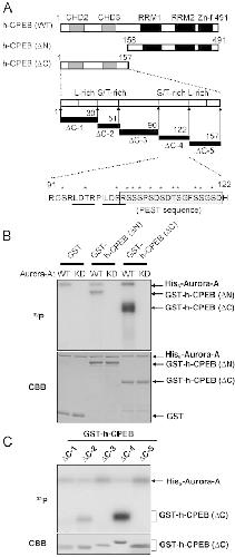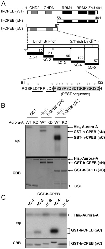 Phosphorylation sites of h-CPEB by Aurora-A. (A) Schematic representation of wild-type and mutants of h-CPEB. Domain organization in h-CPEB protein is shown as follows: CHD2, 3: CPEB homology domain 2, 3; RRM1, 2: RNA recognition motif 1, 2; Zn-f: Zinc-finger domain; PEST: PEST sequence. The N-terminal half of hCPEB, h-CPEBΔC, were further divided into five polypeptides; ΔC1 (aa1–30), ΔC2 (aa31–51), ΔC3 (aa52–90), ΔC4 (aa91–122) and ΔC5 (aa123–157). ΔC1 and ΔC5 contain leucine rich (L rich) sequence, and ΔC2 and ΔC4 contain many serine or threonine residues (S/T rich). Amino acid sequence of ΔC4 fragment is shown. Two Aurora phosphorylation motifs are underlined, and PEST sequence is boxed. Asterisks mark serine and threonine. (B) Phosphorylation of deletion mutants of h-CPEB by Aurora-A in vitro. Purified GST, GST-h-CPEB ΔN or ΔC were incubated with purified His6-Aurora-A of either wild-type (WT) or a kinase inactive mutant (KD) in the presence of [γ-32P]ATP, and incorporation of 32P was then analyzed by SDS-PAGE and autoradiography (upper panel). The gel was also stained with Coomassie Brilliant Blue (CBB) (lower panel). (C) Phosphorylation of h-CPEB ΔC mutants by Aurora-A. GST-CPEB ΔC mutants (ΔC1∼5) were incubated with His6-Aurora-A in the presence of [γ-32P]ATP and analyzed as in (B) (upper panel). The gel was also stained with Coomassie Brilliant Blue (CBB) (lower panel).