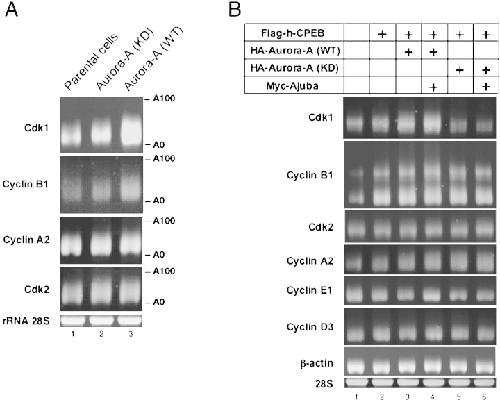 Over-expression of Aurora-A targets cytoplasmic polyadenylation element binding protein and promotes mRNA polyadenylation of Cdk1 and cyclin B1.