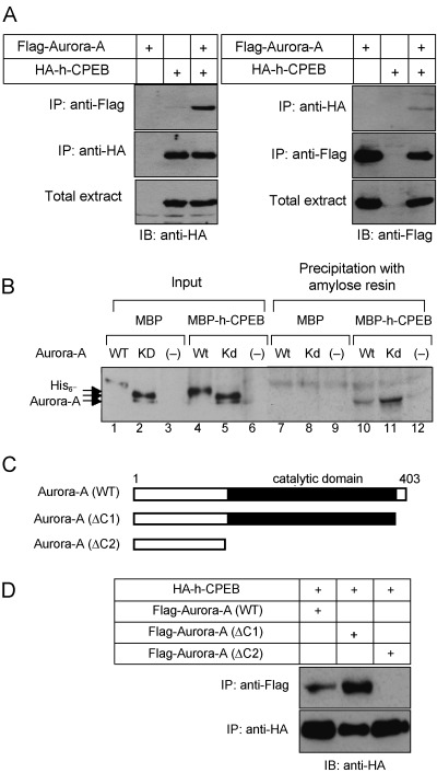 Interaction of h-CPEB with Aurora-A. (A) Interaction of ectopically expressed h-CPEB with Aurora-A in HEK293T cells. Total extracts of cells expressing Flag-Aurora-A, HA-h-CPEB or both proteins were subjected to immunoblot analysis with antibodies to Flag or to HA, as indicated (bottom panels). The same cell lysates were subjected to immunoprecipitation with antibodies to HA or to Flag epitopes and the resulting precipitates were subjected to immunoblot analysis with antibodies to Flag or HA (upper and middle panels). Note that both Flag-Aurora-A (Fig. 1B) and HA-h-CPEB (data not shown) distributed diffusely in cytoplasm. (B) Interaction of maltose binding protein (MBP)-fused h-CPEB and His6-Aurora-A in an in vitro binding assay. MBP-h-CPEB protein or MBP were incubated either with His6-wild-type (WT) or kinase-inactive mutant of Aurora-A (KD), or without Aurora-A (–), and then precipitated with amylose resin beads. Bead-bound proteins were subjected to immunoblot analysis with antibodies to Aurora-A. (C) Schematic representation of wild-type and deletion mutants of Aurora-A. (D) Interaction between h-CPEB and deletion mutants of Aurora-A. Lysates of cells expressing wild-type or deletion mutants (ΔC1 and ΔC2) of Flag-Aurora-A and HA-h-CPEB were subjected to immunoprecipitation as in (A).