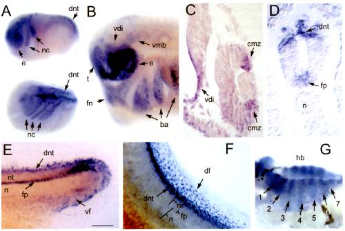 the head, in the eye (e) and in the dorsal neural tube (dnt). Expression in the crest is detected in the mandibular, hyoid and branchial groups (from