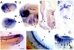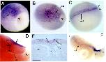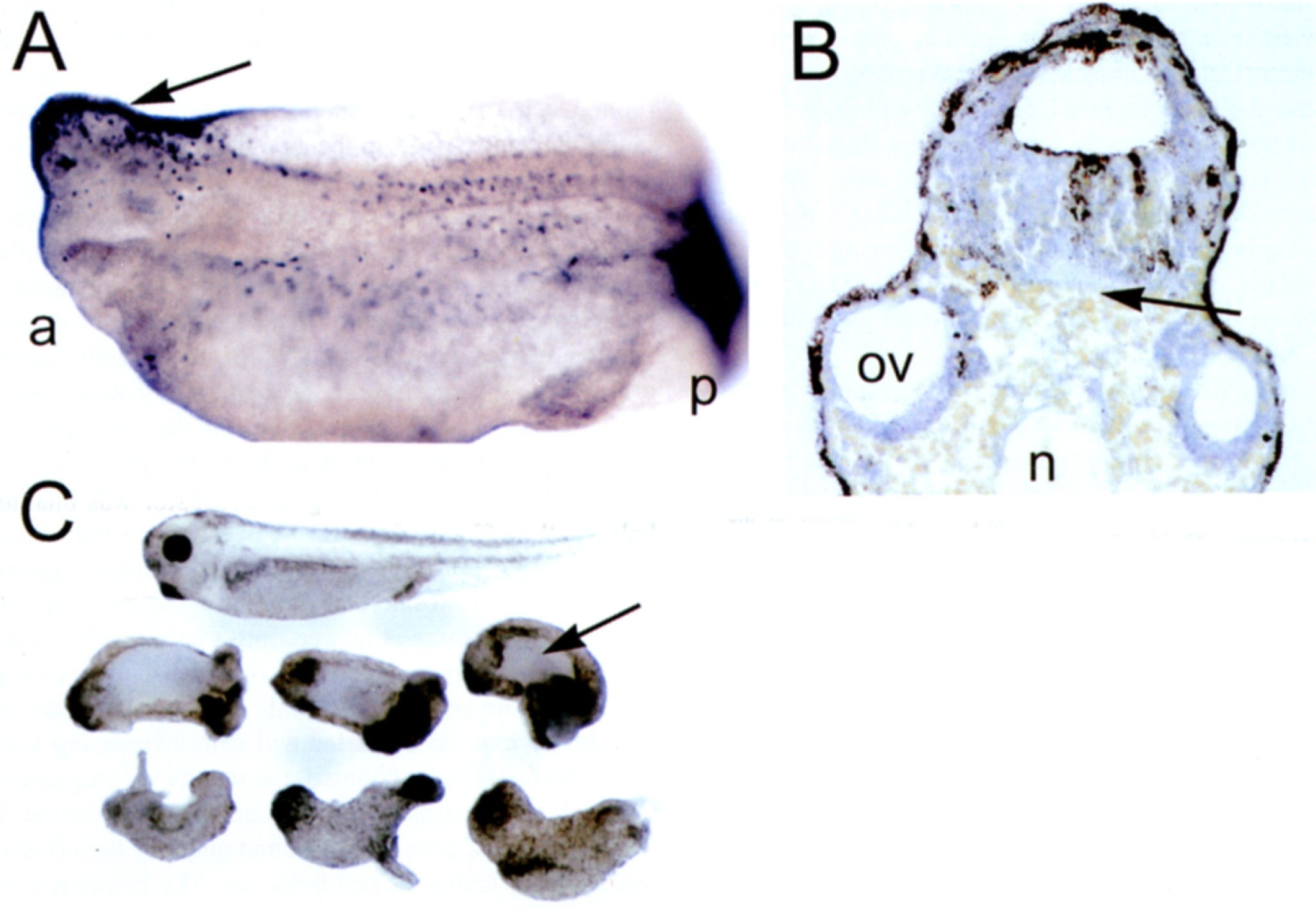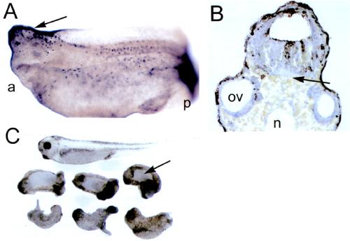 a whole-mount (D) at stage 11-11.5 and in cross section through the anterior region of a stage -14 embryo (E). Arrows point to sites of expression and