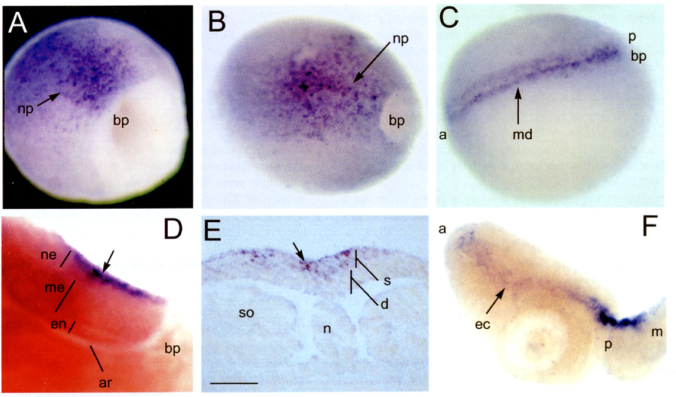 embryos. In all cases dorsal side is up and arrows point to the sites of expression. Note the decreasing size of the blastopore (bp) during gastrulation, a,
